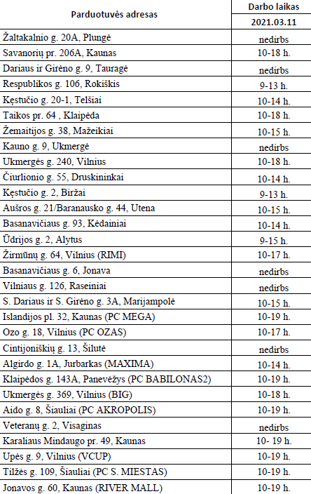 Parduotuvių darbo laikas Kovo 11-ąją 2021-03-10 Kovo 11-ąją, Lietuvos nepriklausomybės atkūrimo dieną, keičiasi daugelio TOPO CENTRO parduotuvių darbo laikas. Kovo 11-ąją dalis parduotuvių nedirbs arba dirbs kitu laiku, nei įprasta. Čia rasite TOPO CENTRO parduotuvių ir jų darbo laikų informaciją>>
