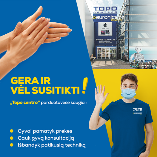 Gera ir vėl susitikti TOPO CENTRO parduotuvėse! 2021-02-14 Nuo 2021 m. vasario 15 d., kai kuriose mūsų parduotuvėse, vėl galėsite pamatyti, išbandyti, pasikonsultuoti ir čia pat įsigyti prekes. Primename, kad visos TOPO CENTRO parduotuvės dirba kaip internetinių užsakymų atsiėmimo centrai, o kai kuriose parduotuvėse, laikantis sustiprintų saugumo ir ploto ribojimo reikalavimų (bendras prekybos plotas neviršija 300 kv.m., o didesnėse parduotuvėse atitvertos leistino dydžio zonos), jau galite apsilankyti ir gyvai. Daugiau informacijos>>