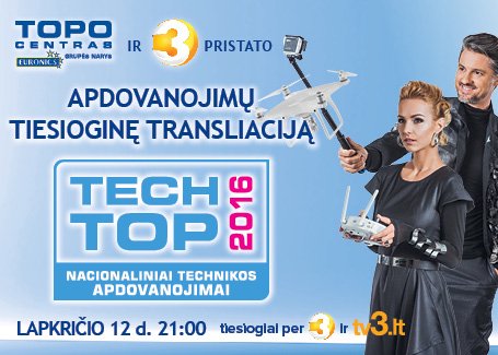 Nacionaliniai technikos apdovanojimai „Tech Top 2018” 2018-11-13 Jau tradiciniais tapę geriausios metų technikos ir inovacijų rinkimai, didžiąją sceną sudrebino jau ketvirtą kartą! Metų televizoriai, telefonai, kompiuteriai, skalbyklės, viryklės, inovatyviausios metų prekės ir dar daugelio kitų kategorijų įrenginiai išrinkti ir apdovanoti iškilmingo renginio metu, kartu su ryškiausiomis scenos ir televizijos žvaigždėmis. Techniškiausias metų šou su įspūdingais pasirodymais žengiančiais koja kojon su naujausiomis technologijos naujienomis, kviečiame žiūrėti transliaciją iš Vilniaus "Siemens" arenos. Žiūrėti transliaciją>>