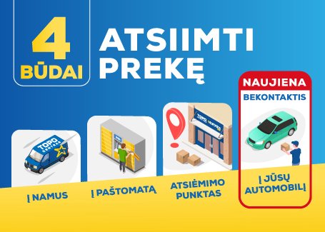 Bekontaktis prekių atsiėmimas neišlipant iš automobilio 2020-04-10 Atsiimkite savo užsakymą neišlipdami iš automobilio. Privažiavus į tam skirtą sustojimo vietą prie TOPO CENTRO parduotuvės, sustojus prie BEKONTAKČIO PREKIŲ ATSIĖMIMO vietos (pažymėta mėlynai) ir paskambinus ant stendo nurodytu telefono numeriu, TOPO CENTRO darbuotojas atneš prekes ir įdės į Jūsų automobilio bagažinę. Daugiau informacijos>>
