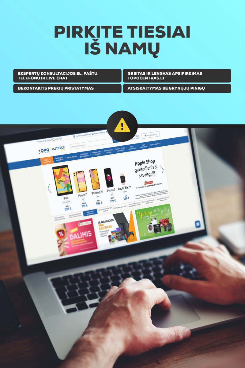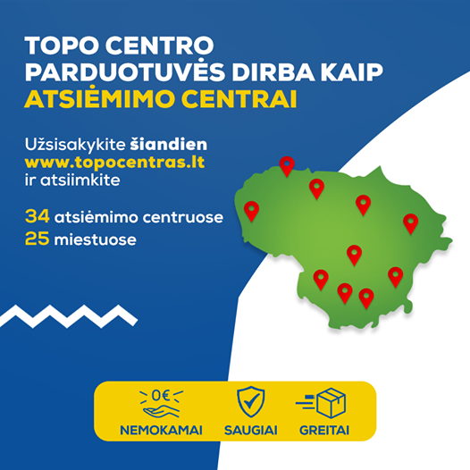 TOPO CENTRO parduotuvės dirba kaip atsiėmimo centrai 2020-12-16 Mums rūpi ne tik Jūsų saugumas, bet ir patogumas – stengiamės, kad Kalėdinės dovanos ir pirkiniai, kuo greičiau jus pasiektų. Todėl TOPO CENTRO parduotuvės nuo gruodžio 16 d. dirba kaip internetinių užsakymų atsiėmimo centrai! • Vos per kelias minutes užsisakykite norimą prekę internetu Topocentras.lt. • Atsiimkite per 1 val. atsiėmimo centre, jei norima prekė yra vietoje. • Į namus pristatysime tą pačią dieną. O jei norite sužinoti daugiau apie prekę, reikia pagalbos renkantis arba įsigijant, susisiekite su mūsų profesionaliais konsultantais: 8 700 50052 Sužinokite daugiau>>